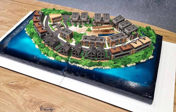Йому все це вдалося. На величезній площі — 1 м х 55 см – розмістилися ліпні котеджі, басейн, пляжі та річка. Вага торту аж 20 кг.