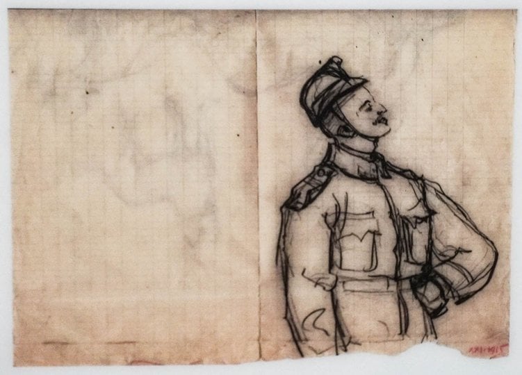 «Тут є сюжети із поля бою або прощання з тими, хто йде на війну, тобто реалістичні сюжети. Також є роботи, в яких художник їх опрацьовує вже в якійсь міфологізованій формі. Тут з’являються монстри, смерть, прощання і Юрій Змієборець як образ перемоги. Цікаво, що багато замальовок були просто на будь-чому, він міг малювати на якихось записках десь з другого боку. По цих рисунках можна зрозуміти, як він готував свій живопис», ‒ розповіла кураторка. А ще тут представлена робота художника над символікою січових стрільців.